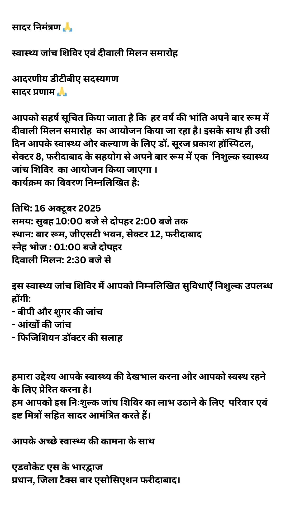 Date: Thursday, 16 October 2025 Time: 10:00 AM to 2:00 PM Venue: Bar Room, GST Bhawan, Sector 12, Faridabad Lunch: 1:00 PM Diwali Meet: From 2:30 PM